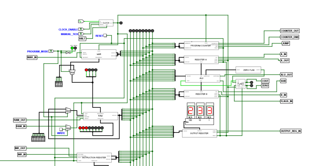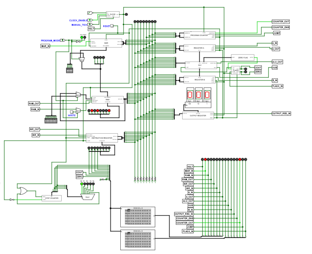 This project is an 8-bit computer designed and simulated in Logic Evolution, inspired by classic breadboard computers. Instead of just following a build, I focused on understanding how data flows through the system and how control signals coordinate execution.